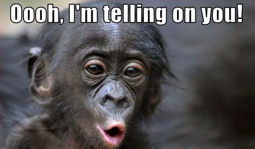 I have a Teddy Bear puppet named Tattle Tale Teddy. If no one is hurt I tell them to go tell Teddy. They seem content with this idea.