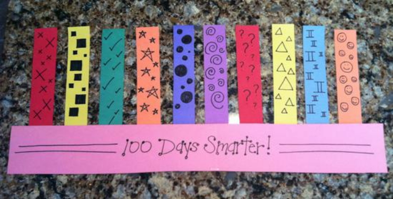 - Cut 12″ x 18″ pieces of construction paper into 2-inch strips, lengthwise. Provide each of your students with a strip to use as the band of their hat. Using a marker, invite your students to decorate the band penning, “Happy 100th Day!”, “100 Days Smarter!”, “I survived 100 days!”, or another festive message.
